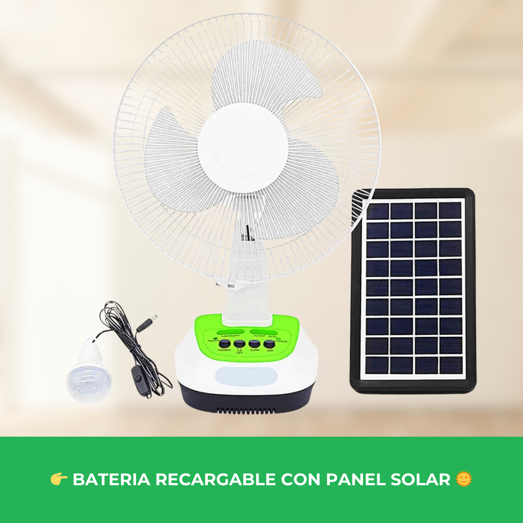 ¿Buscas una solución que te refresque durante el calor, recargue la batería de tu celular, te dé acceso a iluminación con 4 focos LED colgantes y además sea recargable con panel solar?